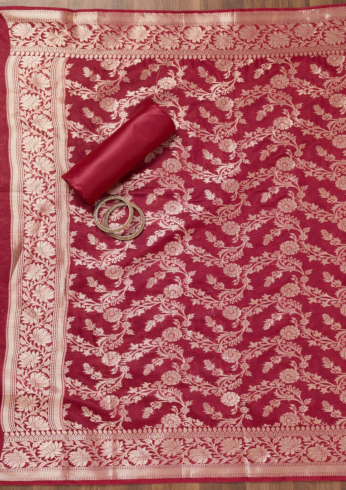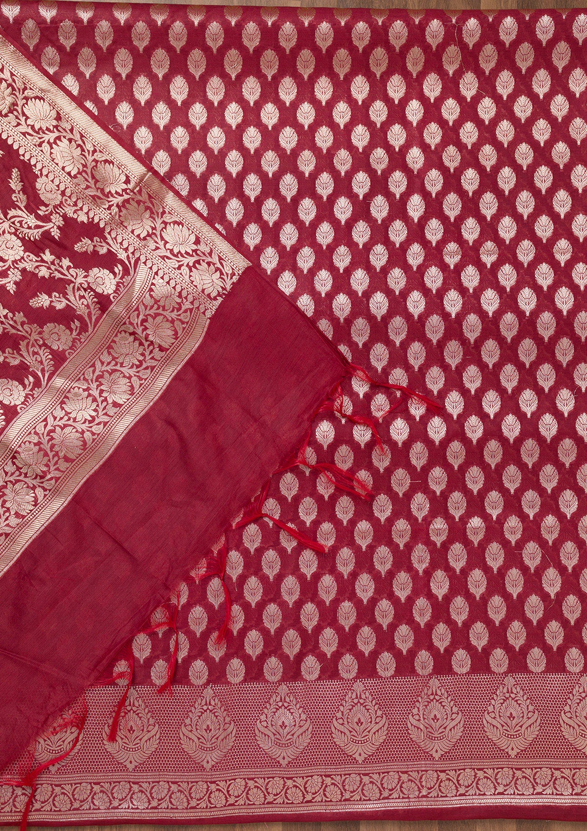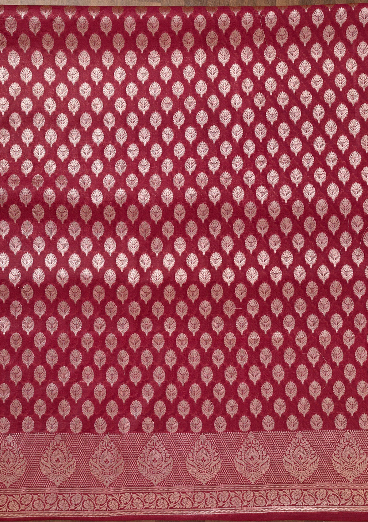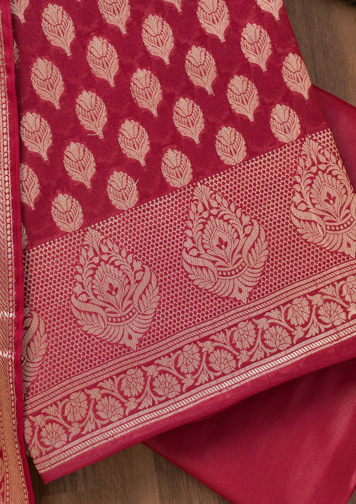 Maroon Salwar Suit in Banarasi fabric, embellished with Zariwork, accompanied by a bottom and dupatta, ensuring premium quality.