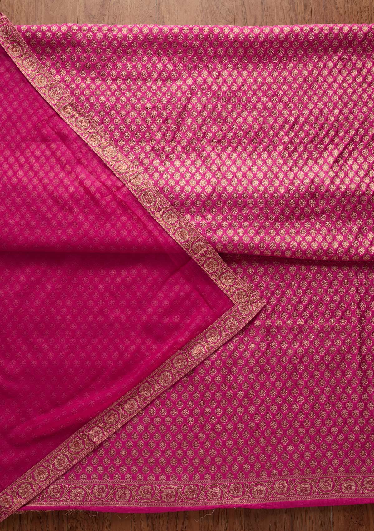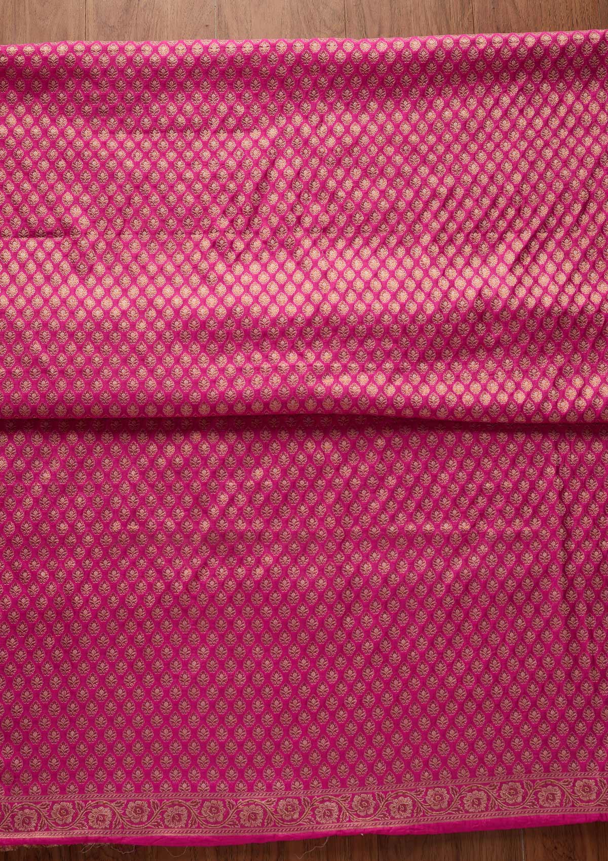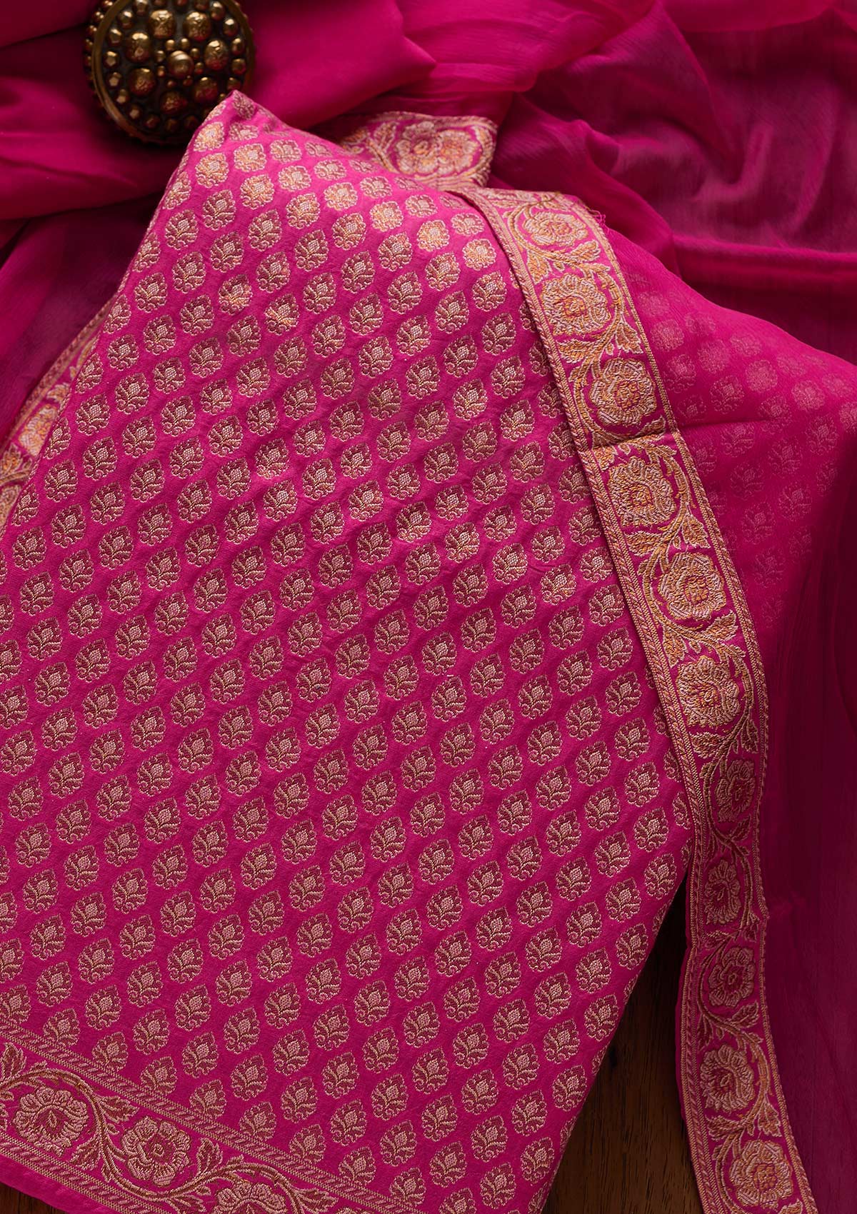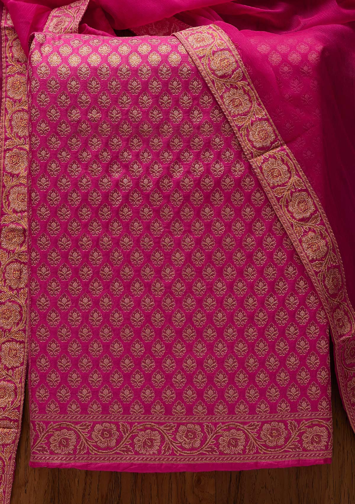 Chic Rani Pink Salwar Suit in Banarasi fabric, embellished with exquisite Zariwork, paired with an unstitched bottom and dupatta, ensuring Valorela's premium quality.